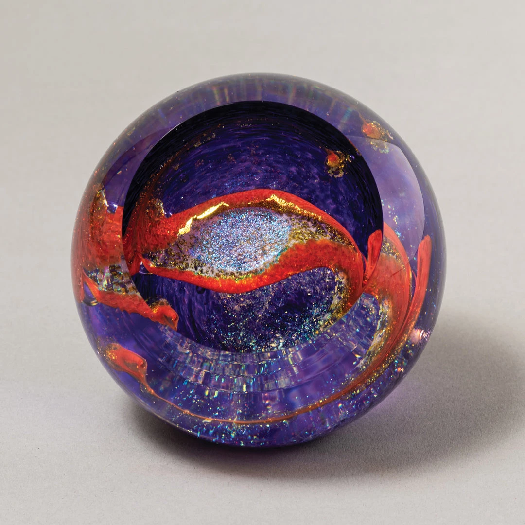 Inspired by the designer’s interpretation of the solar system, each weight takes a team of 2-3 artists to create. These carefully formed designs use a wide spectrum of specialty colors, dichroic glass, glow material, and precious metals.