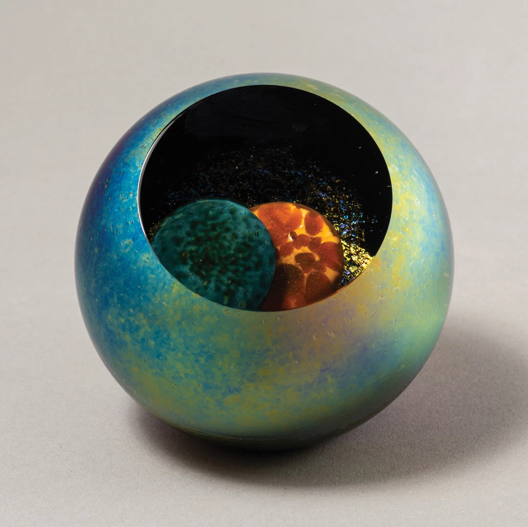 Inspired but the designer’s interpretation of the solar system, each weight takes a team of 2-3 artists to create. These carefully formed designs use a wide spectrum of specialty colors, dichroic glass, glow material, and precious metals.