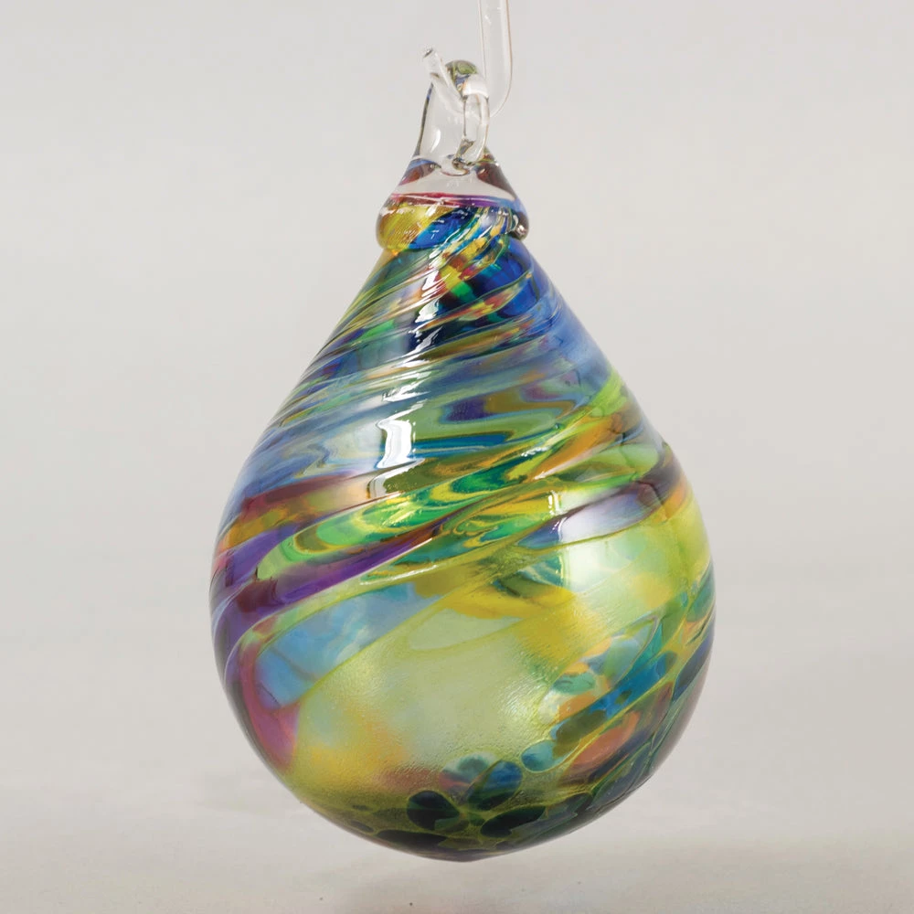 Raindrop style that highlights the beauty of the glass and the skill of the artist. Bright colors enhance the elegance of these charming baubles.