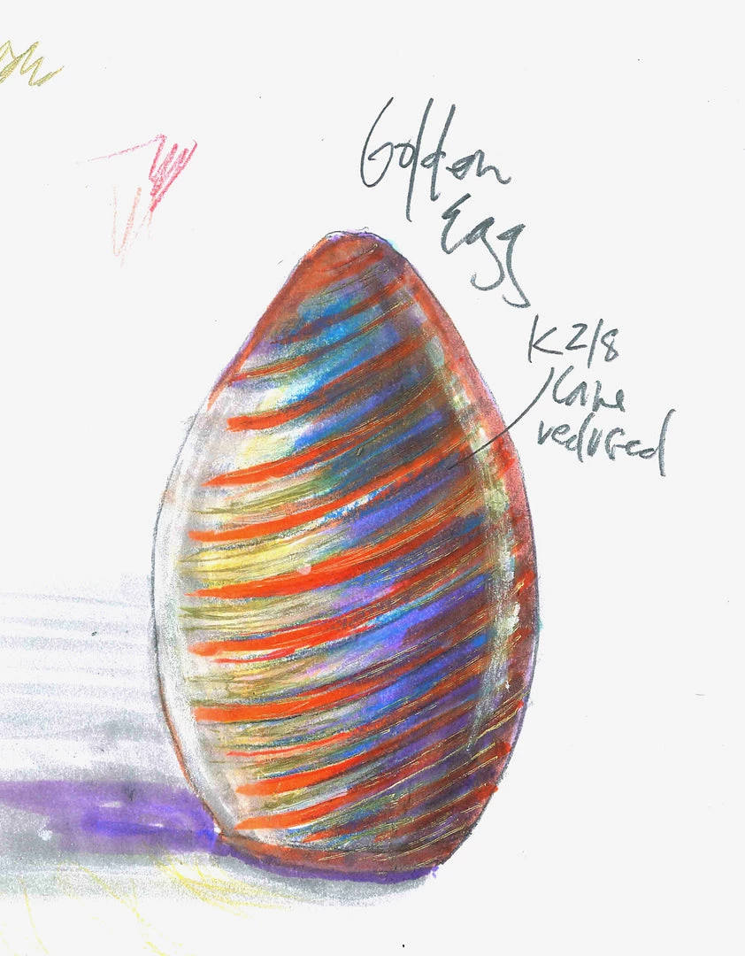 Handmade with ribbons of golden cane, these stunning limited edition dichroic eggs come out in hues of copper and blue that transform in the light.
