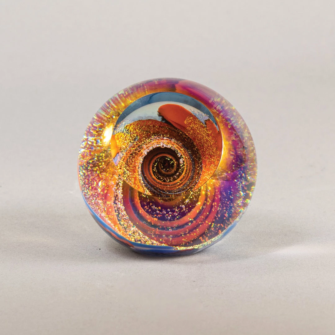 Our fireball paperweights feature explosions of sparkling color and are cut specifically to enhance their hypnotic inner spiral.